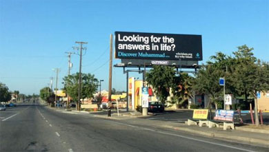 The billboards display different messages, including one declaring that Muhammad taught "love not hate," and "peace not violence."